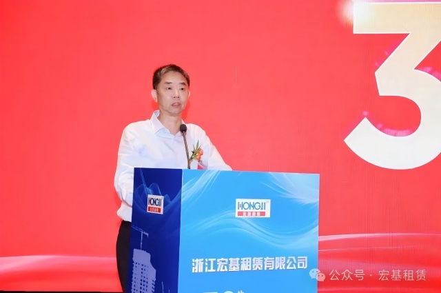 庆典在庄严而热烈的气氛中拉开帷幕。宏基租赁董事长张向中首先登台致辞。他深情回顾了自1984年扎根杭州创业,到1995年正式创立“宏基租赁”品牌,伴随中国改革开放大潮与基建事业蓬勃发展的奋斗历程。“三十年来,我们见证了行业的潮起潮落,经历了市场的风风雨雨,”张向中董事长感慨道,“正是凭着坚定的信念、对市场的敏锐洞察和全体员工的不懈奋斗,我们才得以在塔机租赁的赛道上行稳致远,成长为今天的模样。感恩这个伟大的时代,感恩所有支持宏基发展的伙伴们!”